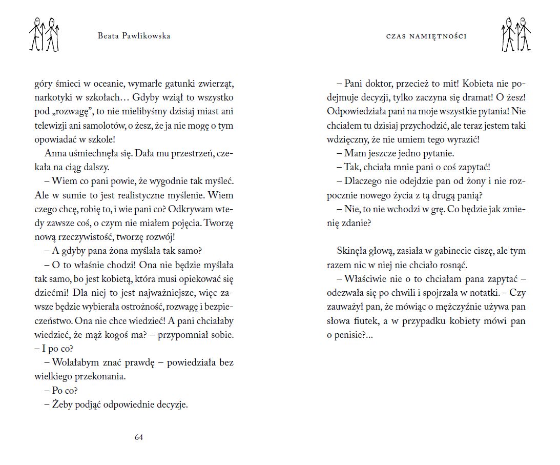 – Pani doktor, przecież to mit! Kobieta nie podejmuje decyzji, tylko zaczyna się dramat! O żesz! Odpowiedziała pani na moje wszystkie pytania! Nie chciałem tu dzisiaj przychodzić, ale teraz jestem taki wdzięczny, że nie umiem tego wyrazić!