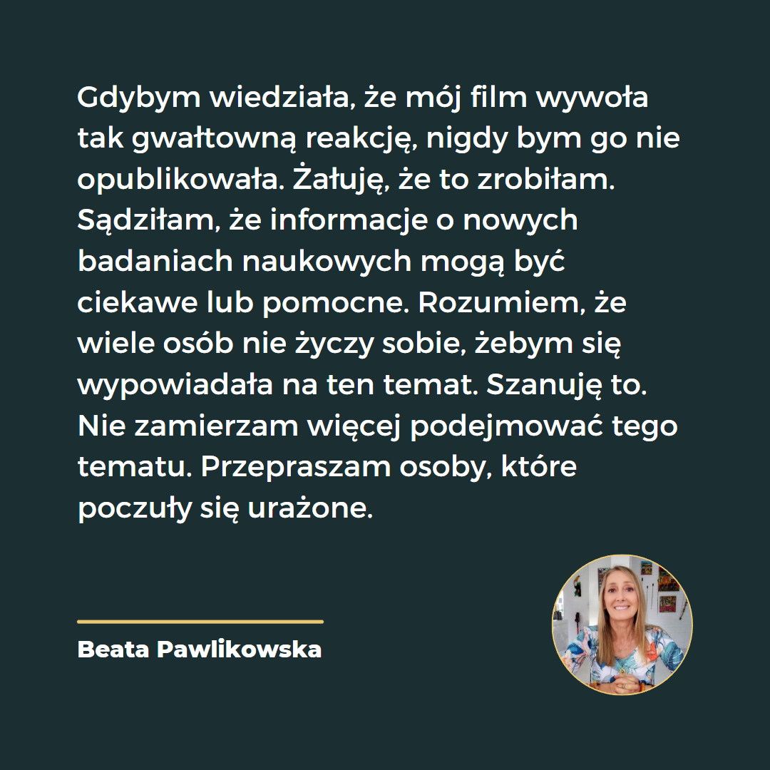 Gdybym wiedziała, że mój film wywoła tak gwałtowną reakcję, nigdy bym go nie opublikowała. Żałuję, że to zrobiłam. Sądziłam, że informacje o nowych badaniach naukowych mogą być ciekawe lub pomocne. Rozumiem, że wiele osób nie życzy sobie, żebym się wypowiadała na ten temat. Szanuję to. Nie zamierzam więcej podejmować tego tematu. Przepraszam osoby, które poczuły się urażone.
