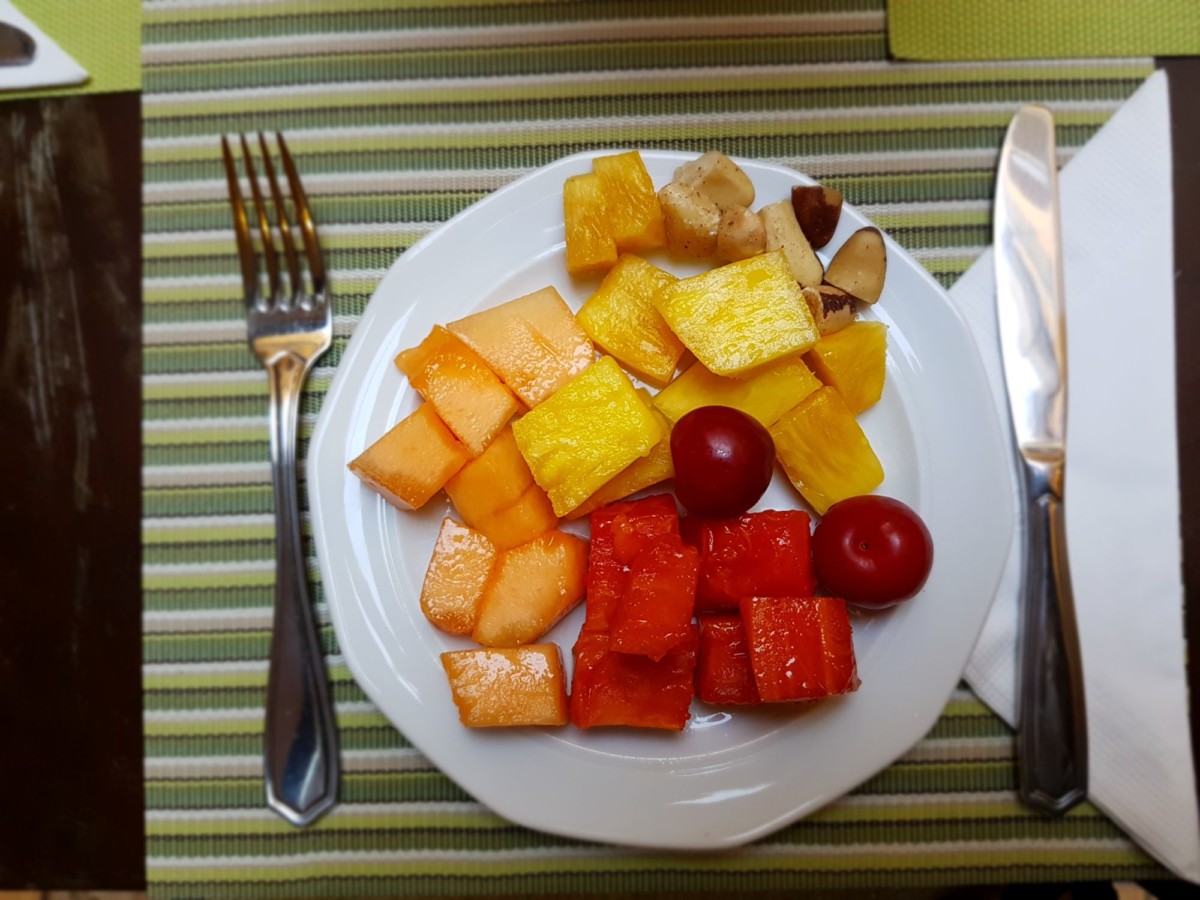 Melon, ananas, arbuz, śliwki i orzechy brazylijskie, śniadanie w Bogocie, Kolumbia