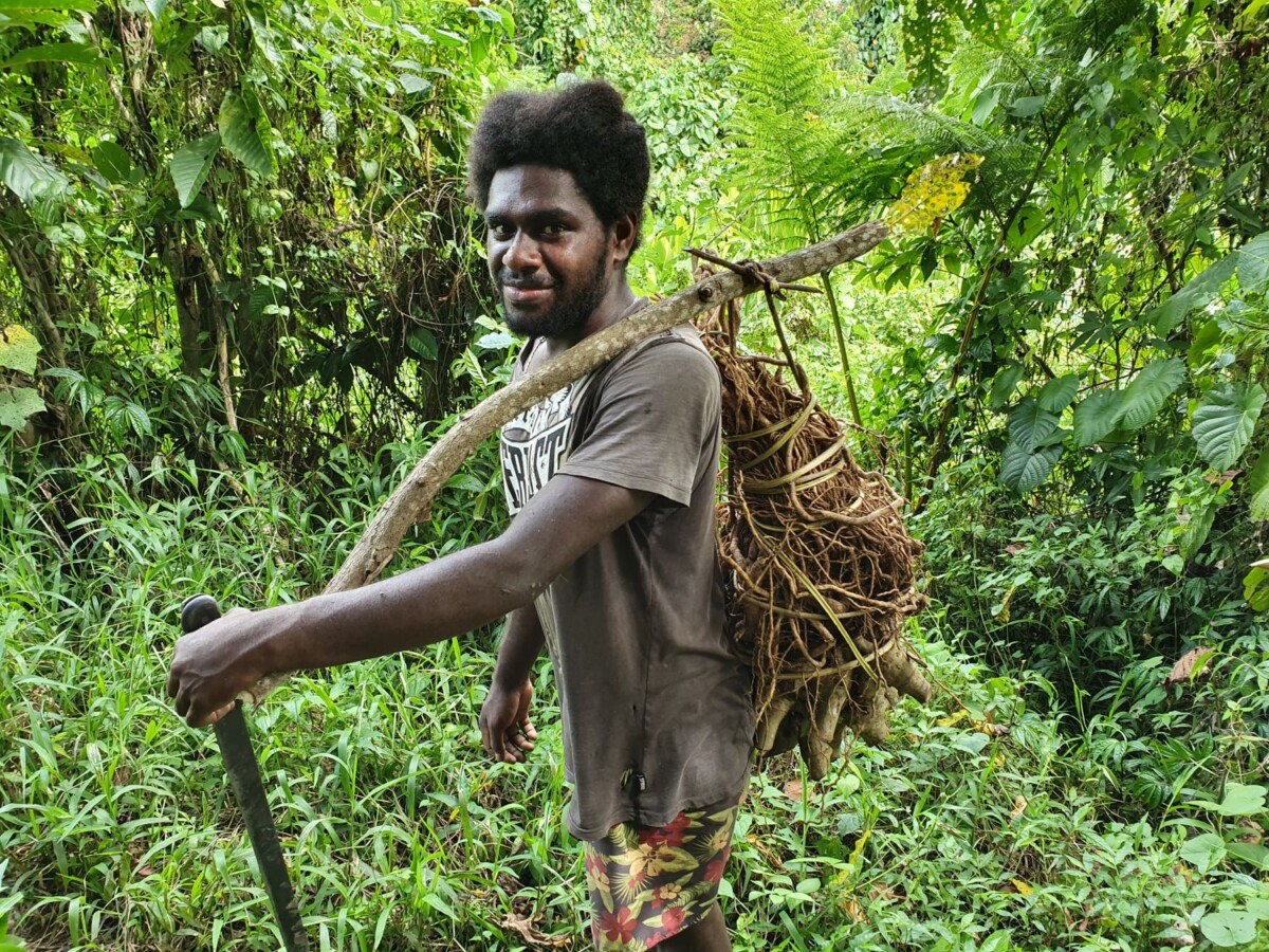 Tubylec spotkany w dżungli z ładunkiem roślin, z których robi się rytualny napój kava.