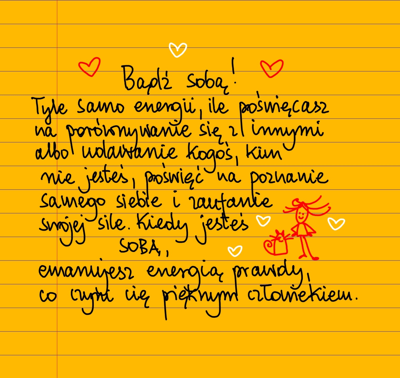 Bądź sobą. Tyle samo energii, ile poświęcasz na porównywanie się z innymi albo udawanie kogoś, kim nie jesteś, poświęć na poznanie samego siebie i zaufanie swojej sile. Kiedy jesteś sobą, emanujesz energią prawdy, co w oczach innych czyni cię pięknym człowiekiem ❤