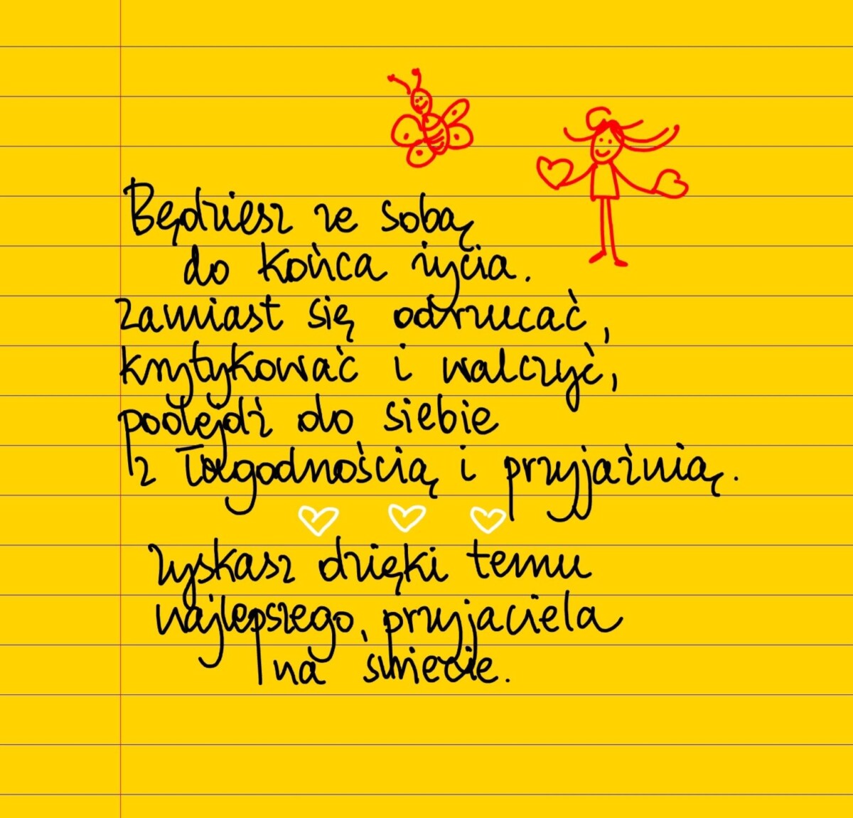 Będziesz ze sobą do końca życia. Zamiast się odrzucać, krytykować i walczyć, podejdź do siebie z łagodnością i przyjaźnią. Zyskasz w ten sposób najlepszego przyjaciela na świecie. #żółtakartka