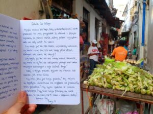 Byłam dzisiaj na wyspie Tumbatu na północ od Zanzibaru. To wyspa zamieszkana przez ludzi, którzy żyją dzisiaj tak jak 100 lat temu. Gotują na ogniu, łowią, uprawiają maniok i banany. Żeby wejść do wioski musiałam ubrać się w kangę, czyli tradycyjny strój dla kobiet.
