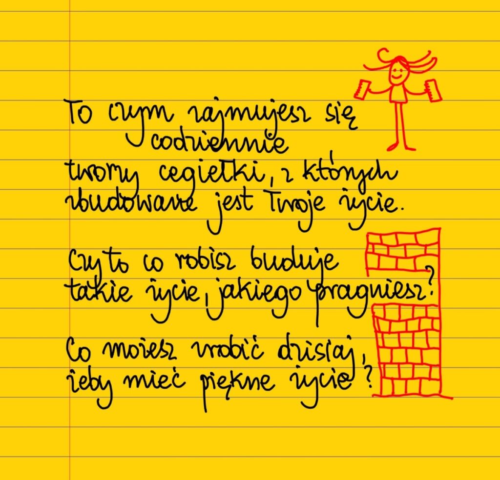 To czym zajmujesz się codziennie tworzy cegiełki, z których zbudowane jest twoje życie. Zastanów się dzisiaj czy to co robisz buduje takie życie, jakiego pragniesz? Jeśli nie, to co możesz dodać do swojego dnia, żeby przybliżyć się do swoich marzeń? #żółtakartka