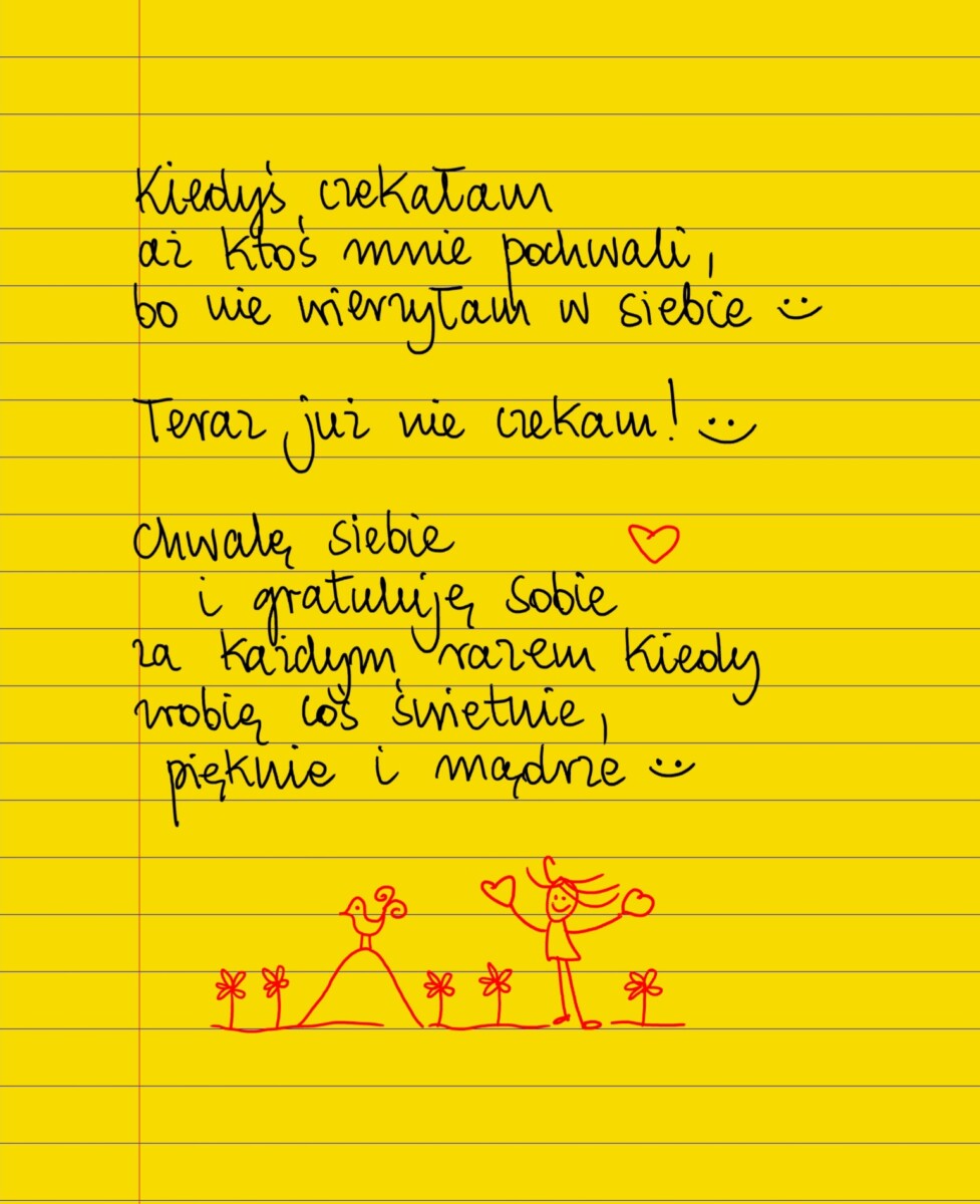 Kiedyś czekałam aż ktoś mnie pochwali, bo nie wierzyłam w siebie 🙂 Teraz już nie czekam! 🙂 Chwalę siebie i gratuluję sobie za każdym razem, kiedy zrobię coś świetnie, pięknie i mądrze 🙂 #żółtakartka