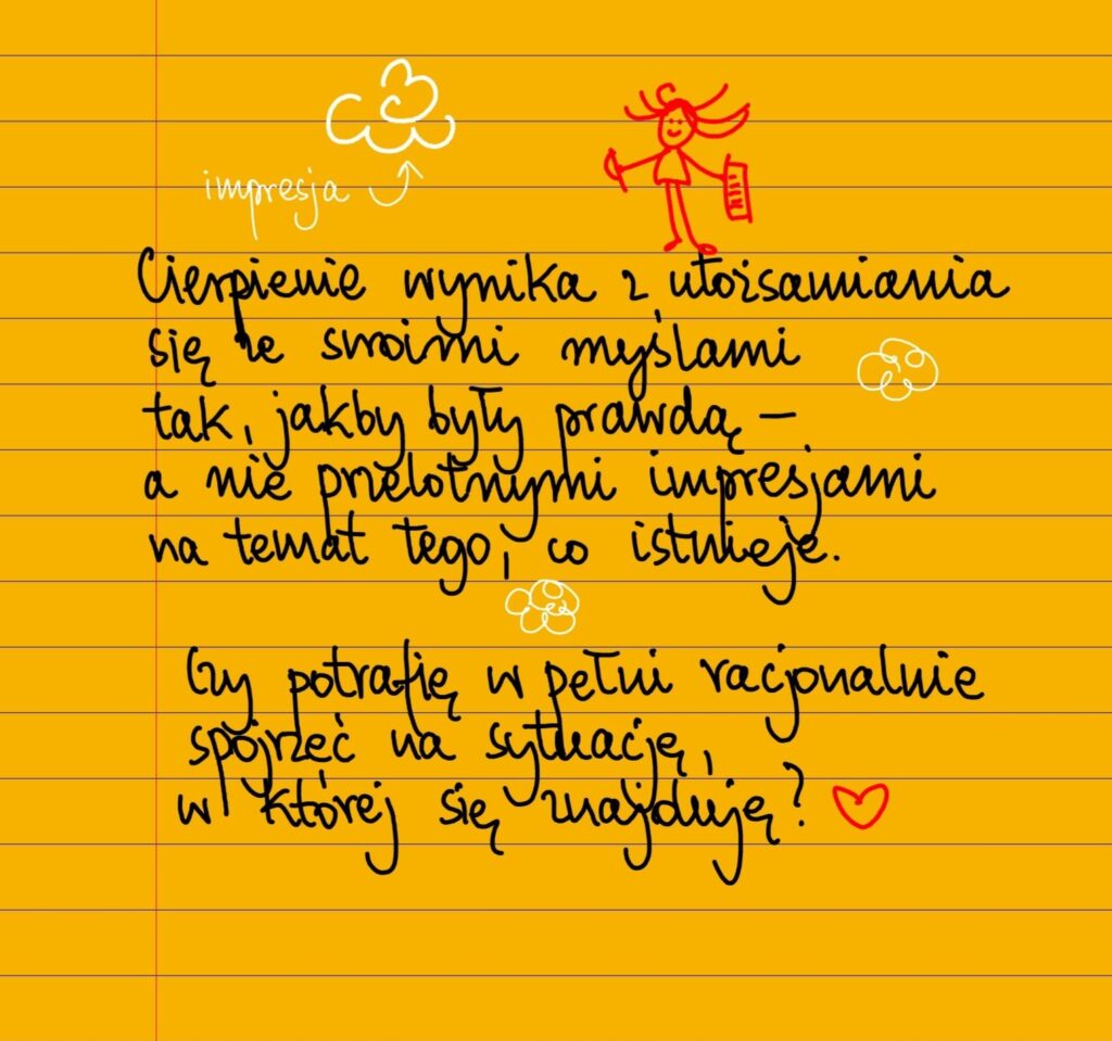 Cierpienie wynika z utożsamiania się ze swoimi myślami, tak jakby były prawdą, a nie przelotnymi impresjami na temat tego, co istnieje w rzeczywistości. Czy potrafię w pełni racjonalnie spojrzeć na sytuację, w której się znajduję?
