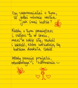 Żyjemy w świecie utkanym z prawdy, dobra i miłości. To prawda, ludzie czasem o tym zapominają i wtedy życie na różne sposoby próbuje im o tym przypomnieć – daje kuksańce, zatrzymuje w drodze albo dmucha życiowym wiatrem tak mocno, że człowiek upada i wydaje mu się, że wszystko stracił, podczas gdy w rzeczywistości to jest pierwszy krok do tego, żeby odzyskać wszystko, co jest naprawdę ważne. Czasem trzeba się przewrócić, żeby z nowej perspektywy zobaczyć to, co w innych okolicznościach zawsze Ci umykało. Wszystko będzie dobrze, pamiętaj o tym, wszystko będzie dobrze!