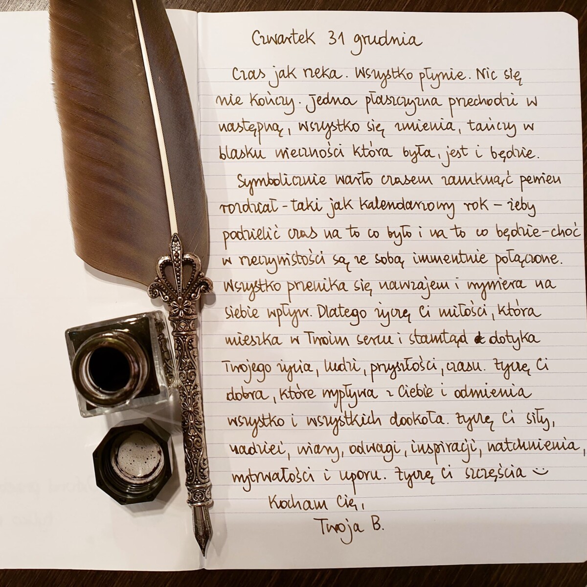 Symbolicznie warto czasem zamknąć pewien rozdział – taki jak kalendarzowy rok – żeby podzielić czas na to co było i na to co będzie – choć w rzeczywistości wszystko jest ze sobą immanentnie połączone. Wszystko przenika się nawzajem i wywiera na siebie wpływ. Dlatego życzę Ci miłości, która mieszka w Twoim sercu i stamtąd dotyka Twojego życia, ludzi, przyszłości, czasu. Życzę Ci dobra, które wypływa z Ciebie i odmienia wszystko i wszystkich dookoła. Życzę Ci siły, nadziei, wiary, odwagi, inspiracji, natchnienia, wytrwałości i uporu. Życzę Ci szczęścia 😊