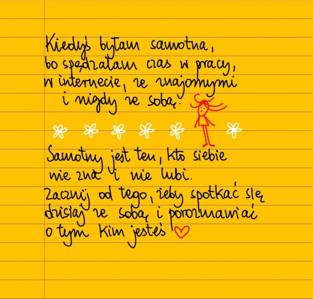 Kiedyś byłam samotna, bo spędzałam czas w pracy, w internecie, ze znajomymi i nigdy z samą sobą. Samotny jest ten, kto siebie nie zna i nie lubi. Zacznij od tego, żeby dzisiaj spotkać się ze sobą i porozmawiać o tym kim jesteś ❤ #żółtakartka
