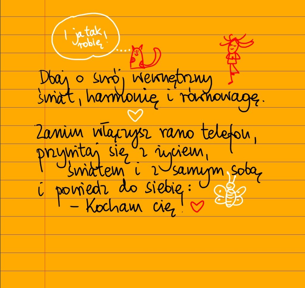Dbaj o swój wewnętrzny świat, harmonię i równowagę. Zanim włączysz rano telefon, przywitaj się z życiem, światem i z samym sobą, powiedz do siebie: KOCHAM CIĘ! ❤