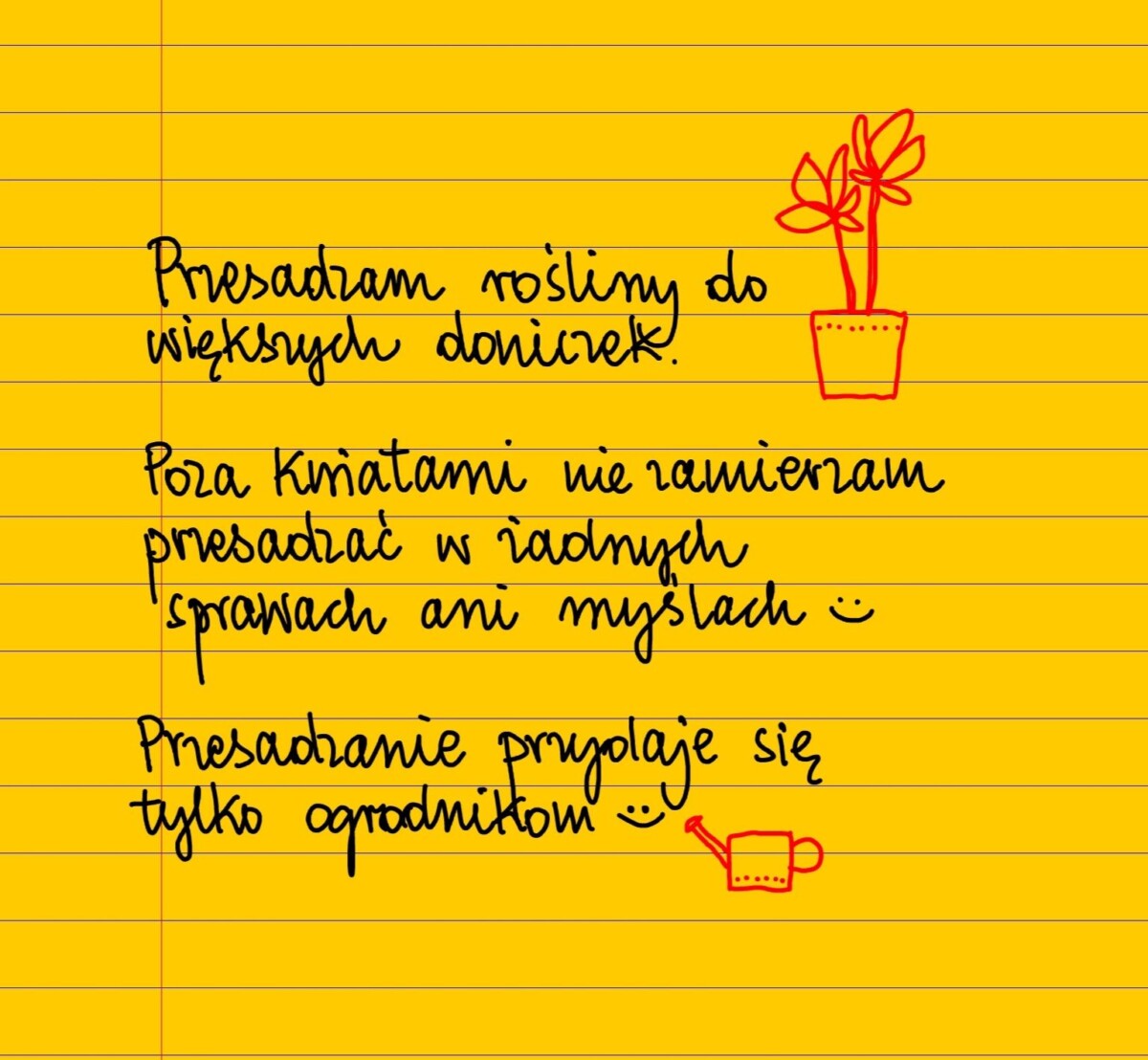 Przesadzam rośliny do większych doniczek. Poza kwiatami nie zamierzam przesadzać w niczym innym – w żadnych sprawach ani myślach 😊 Przesadzanie przydaje się tylko ogrodnikom 😊#żółtakartka