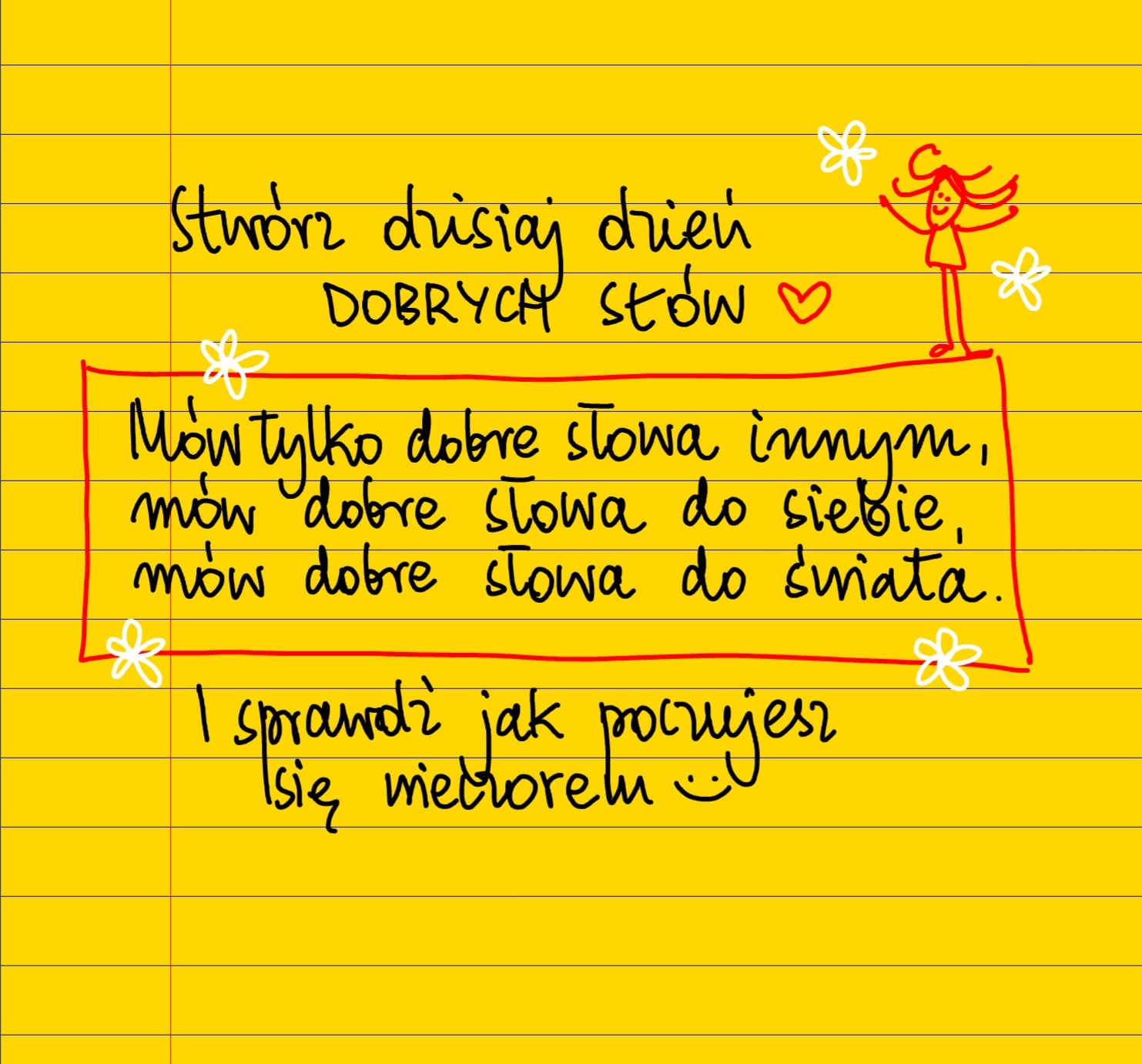 Stwórz dzisiaj dzień DOBRYCH SŁÓW. Mów tylko dobre słowa innym, mów dobre słowa do siebie, mów dobre słowa do świata. I sprawdź jak poczujesz się wieczorem ❤ #żółtakartka #beatapawlikowska