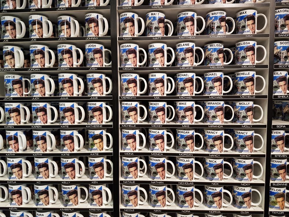 Kubki z portretem Elvisa sprzedawane w sklepie w Graceland.