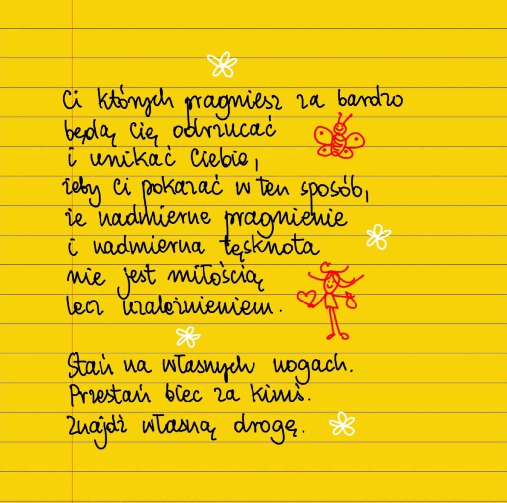 Ci których pragniesz za bardzo będą Cię odrzucać i unikać Ciebie, żeby pokazać Ci w ten sposób, że nadmierne pragnień I nadmierna tęsknota nie jest miłością lecz uzależnieniem. Stań na własnych nogach. Przestań biec za kimś. Znajdź własną drogę. #żółtakartka