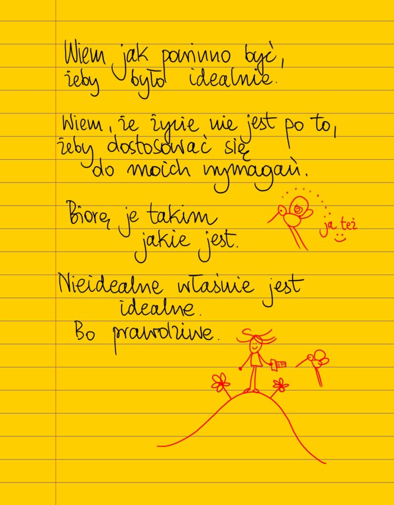 Wiem jak powinno być, żeby było idealnie. Wiem, że życie nie jest po to, żeby dostosować się do moich wymagań. Biorę ja takim, jakie jest. Nieidealne jest właśnie idealne, bo prawdziwe. #żółtakartka