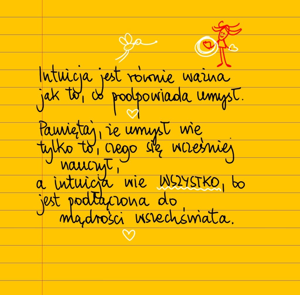 Intuicja jest równie ważna, jak to, co podpowiada umysł. Pamiętaj, że umysł wie tylko to, czego się wcześniej nauczył, a intuicja wie WSZYSTKO, bo jest podłączona do mądrości wszechświata.