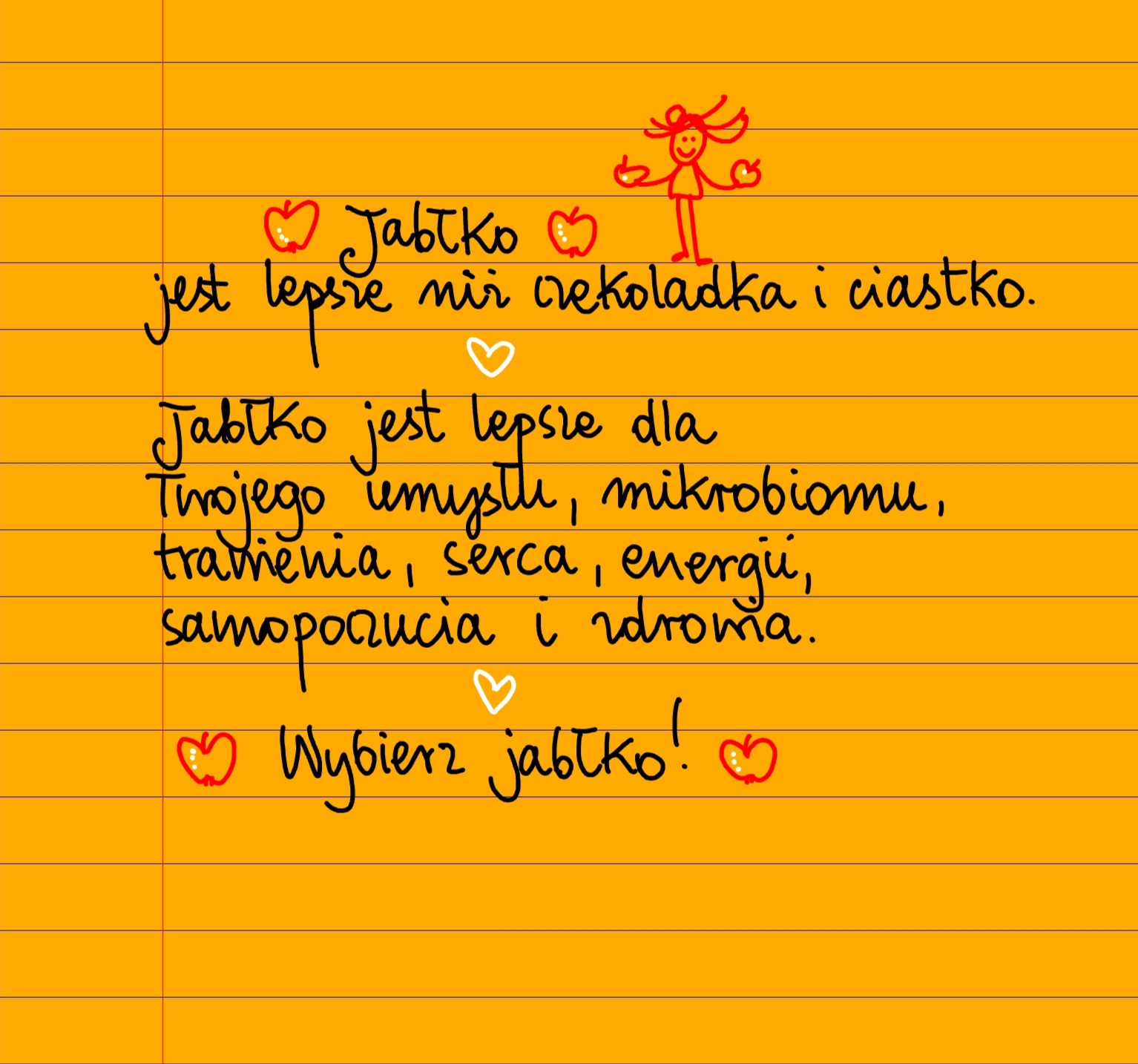 Jabłko jest lepsze niż czekoladka albo ciastko. Jabłko jest lepsze dla twojego umysłu, mikrobiomu, trawienia, serca, energii, samopoczucia i zdrowia. Wybierz jabłko! ❤