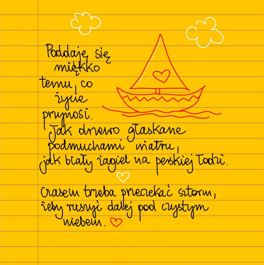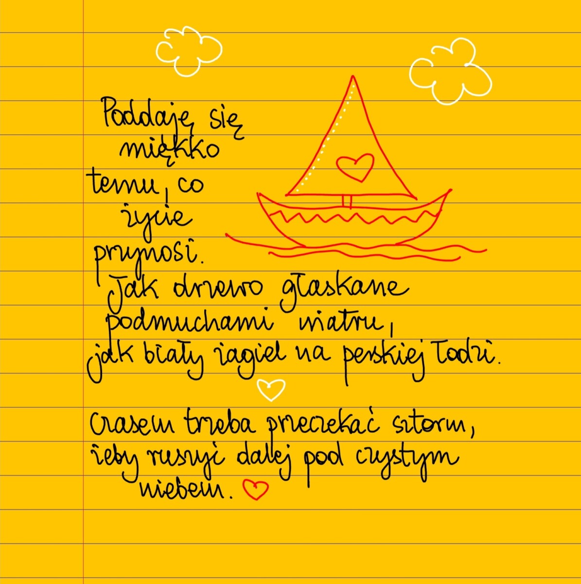 Poddaję się miękko temu, co przynosi życie. Jak drzewo głaskane wiatrem, jak żagiel na perskiej łodzi. Czasem trzeba przeczekać sztorm, żeby ruszyć dalej pod czystym niebem. #żółtakartka