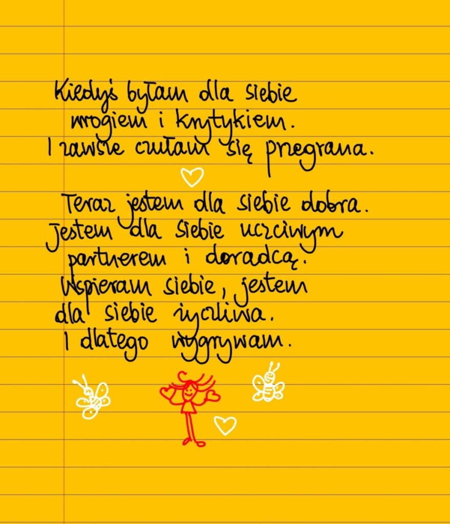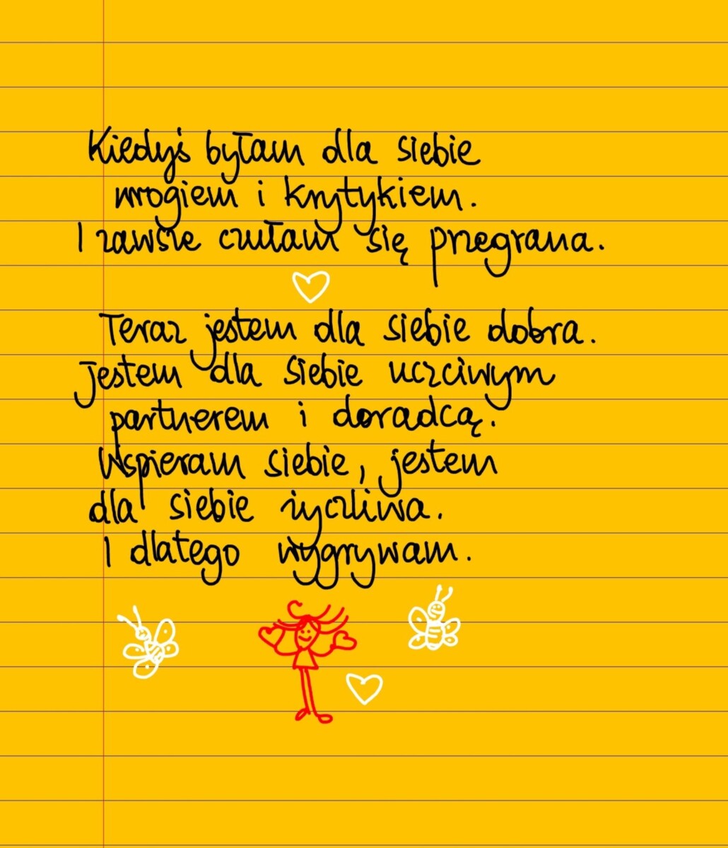 Kiedyś byłam dla siebie wrogiem i krytykiem. I zawsze czułam się przegrana. Teraz jestem dla siebie dobra. Jestem dla siebie uczciwym partnerem i doradcą. Wspieram siebie, jestem dla siebie życzliwa. I dlatego wygrywam. #żółtakartka