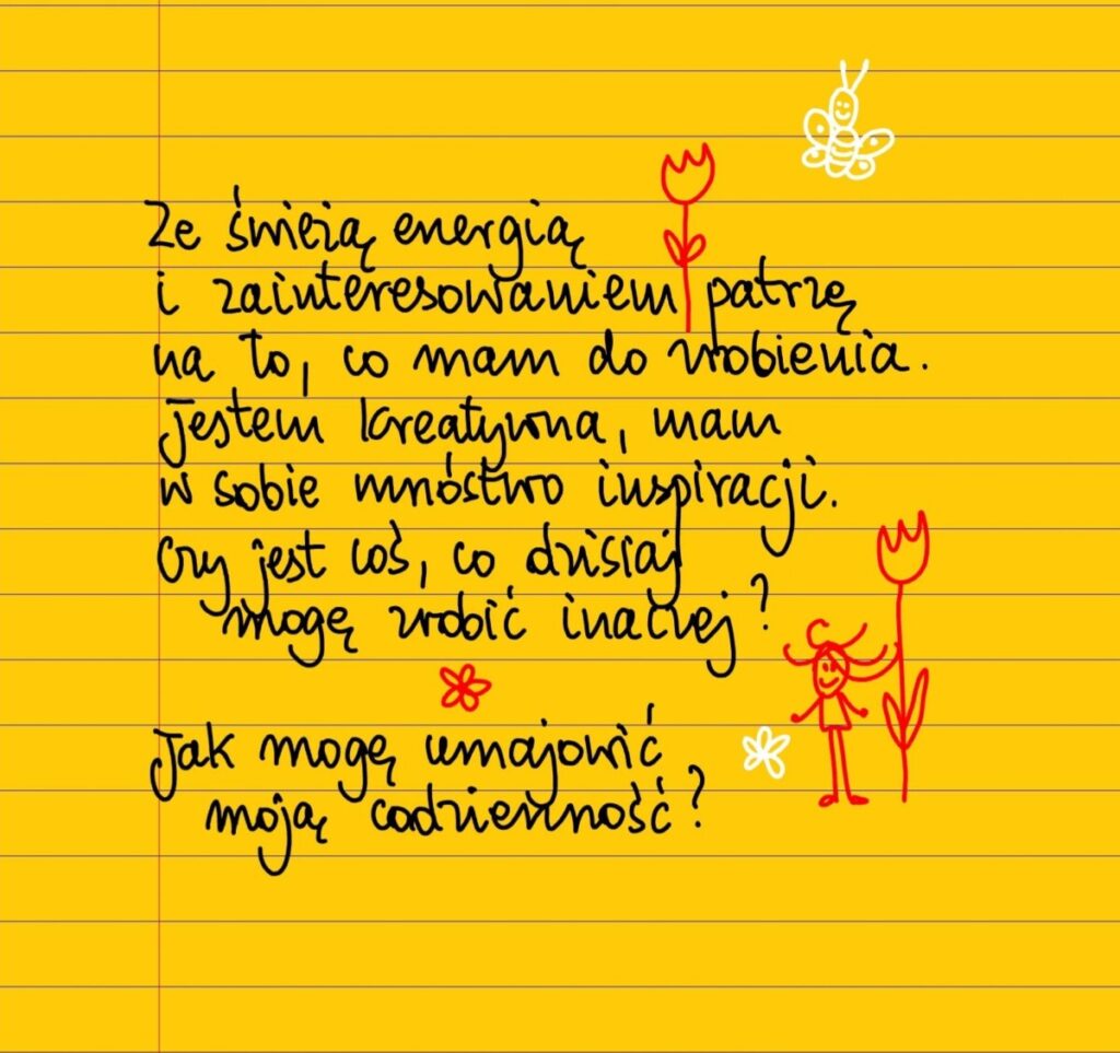 Ze świeżą energią i zainteresowaniem patrzę na to, co mam do zrobienia. Jestem kreatywna, mam w sobie mnóstwo inspiracji. Czy jest coś, co dzisiaj mogę zrobić inaczej? Jak mogłabym umajowić moją codzienność? #żółtakartka