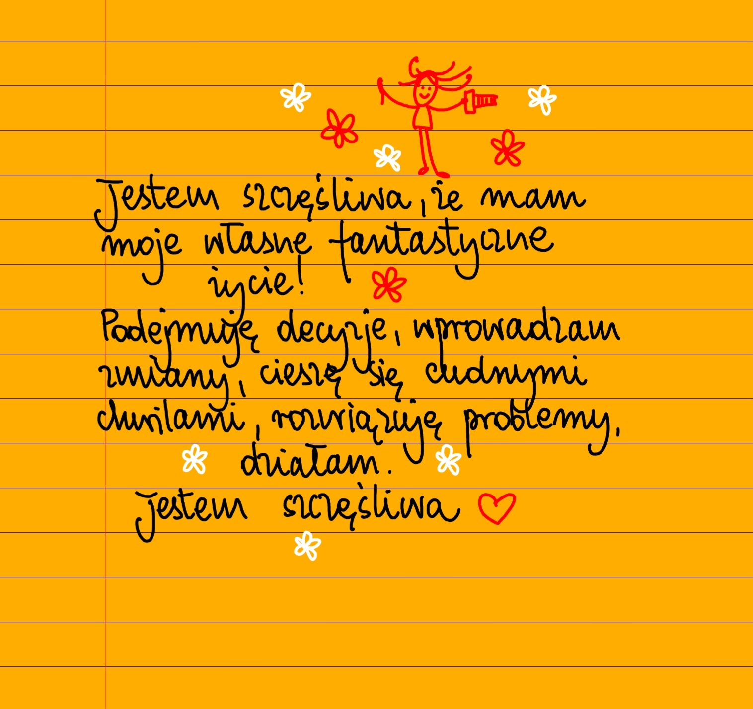 Jestem szczęśliwa, że mam moje własne fantastyczne życie! Podejmuję decyzje, wprowadzam zmiany, cieszę się cudnymi chwilami, rozwiązuję problemy, działam. Jestem szczęśliwa ❤