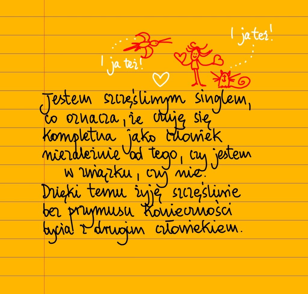 Jestem szczęśliwym singlem, co oznacza, że czuję się kompletna jako człowiek niezależnie od tego, czy jestem w związku, czy nie. Dzięki temu żyję szczęśliwie bez przymusu konieczności bycia z drugim człowiekiem ❤