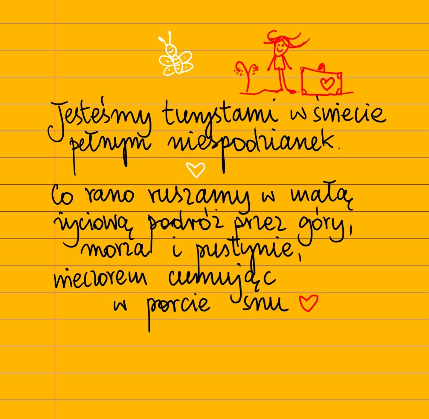 Jesteśmy turystami w świecie pełnym niespodzianek. Co rano ruszamy w małą życiową podróż przez góry, morza i pustynie, wieczorem cumując w porcie snu ❤ #żółtakartka #beatapawlikowska