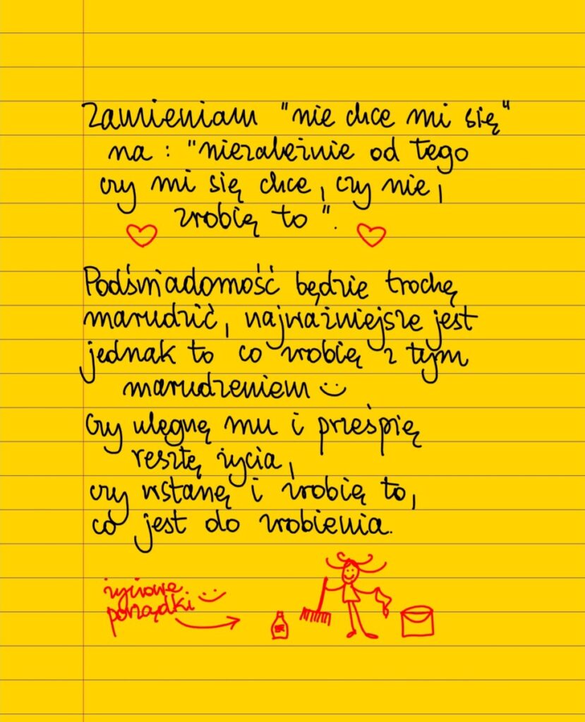 Zamieniam „nie chce mi się” na „niezależnie od tego czy mi się chce, czy nie, zrobię to!” Podświadomość może trochę marudzić, najważniejsze jednak jest to co ja z tym marudzeniem zrobię. Czy ulegnę mu i prześpię resztę życia, czy wstanę…