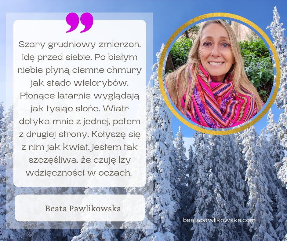 Piąta rano. Ciemna noc. Na świeżym śniegu moje kroki są pierwsze. Wszyscy jeszcze śpią. Wszyscy?… Przy głównej drodze ktoś szeroką łopatą odgarnia śnieg. Mówię dzień dobry i zagaduję o święta. – Proszę pani – odpowiada pan z łopatą. – Ja…