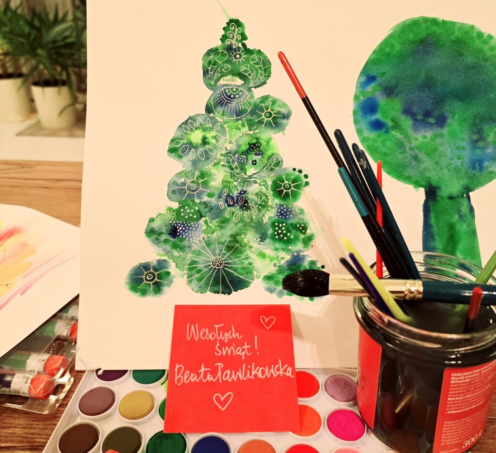 A jednak mam choinkę! Napisałam wczoraj, że nie chcę mieć choinki, bo kocham drzewa i nie chcę zadawać im cierpienia. Namalowałam więc dzisiaj choinkę, przy której będę spędzała święta. Wesołych świąt! ❤