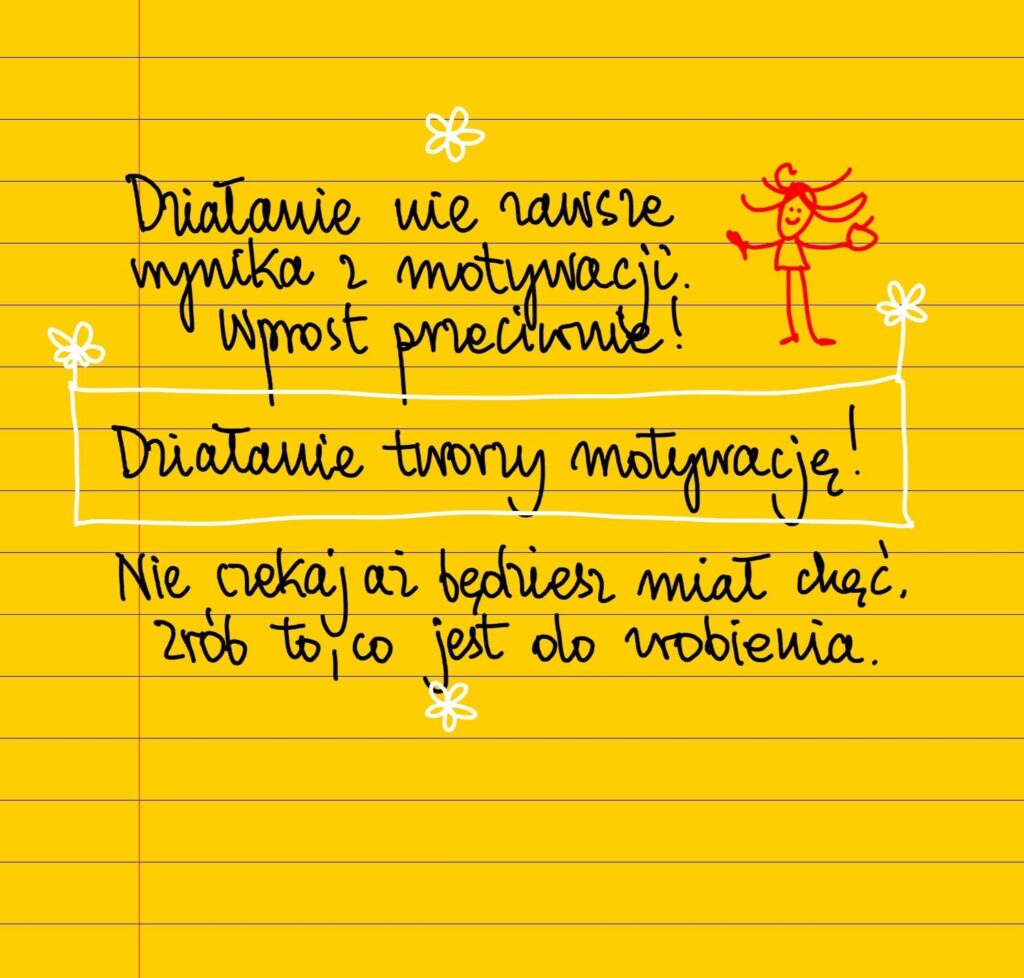 🔥 Działanie nie zawsze wynika z motywacji. Wprost przeciwnie. Bardzo często działanie tworzy motywację. Nie czekaj aż będziesz miał chęć. Zrób to, co jest do zrobienia.