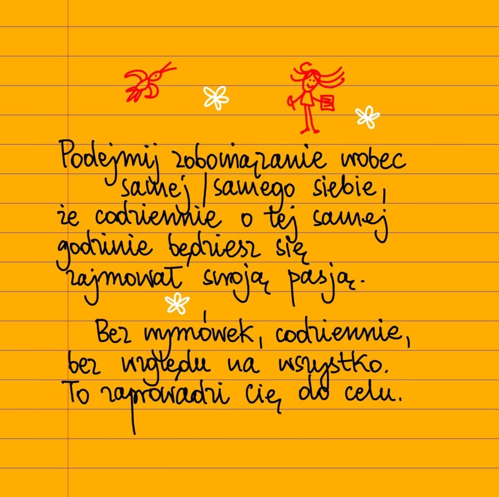 Podejmij zobowiązanie wobec samej/samego siebie, że codziennie o tej samej godzinie będziesz zajmował się swoją pasją. Bez wymówek, codziennie, bez względu na wszystko. To zaprowadzi cię do celu ❤ #żółtakartka