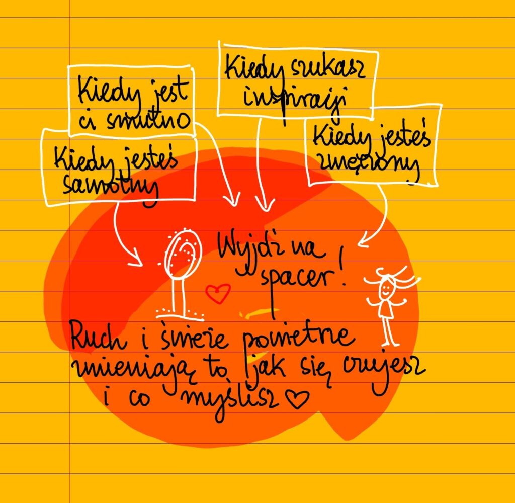 Kiedy jest ci smutno, pójdź na spacer. Kiedy szukasz inspiracji, pójdź na spacer. Kiedy jesteś zmęczony, pójdź na spacer. Kiedy czujesz się samotny, pójdź na spacer. Ruch i świeże powietrze natychmiast zmieniają to jak się czujesz i co myślisz. #żółtakartka