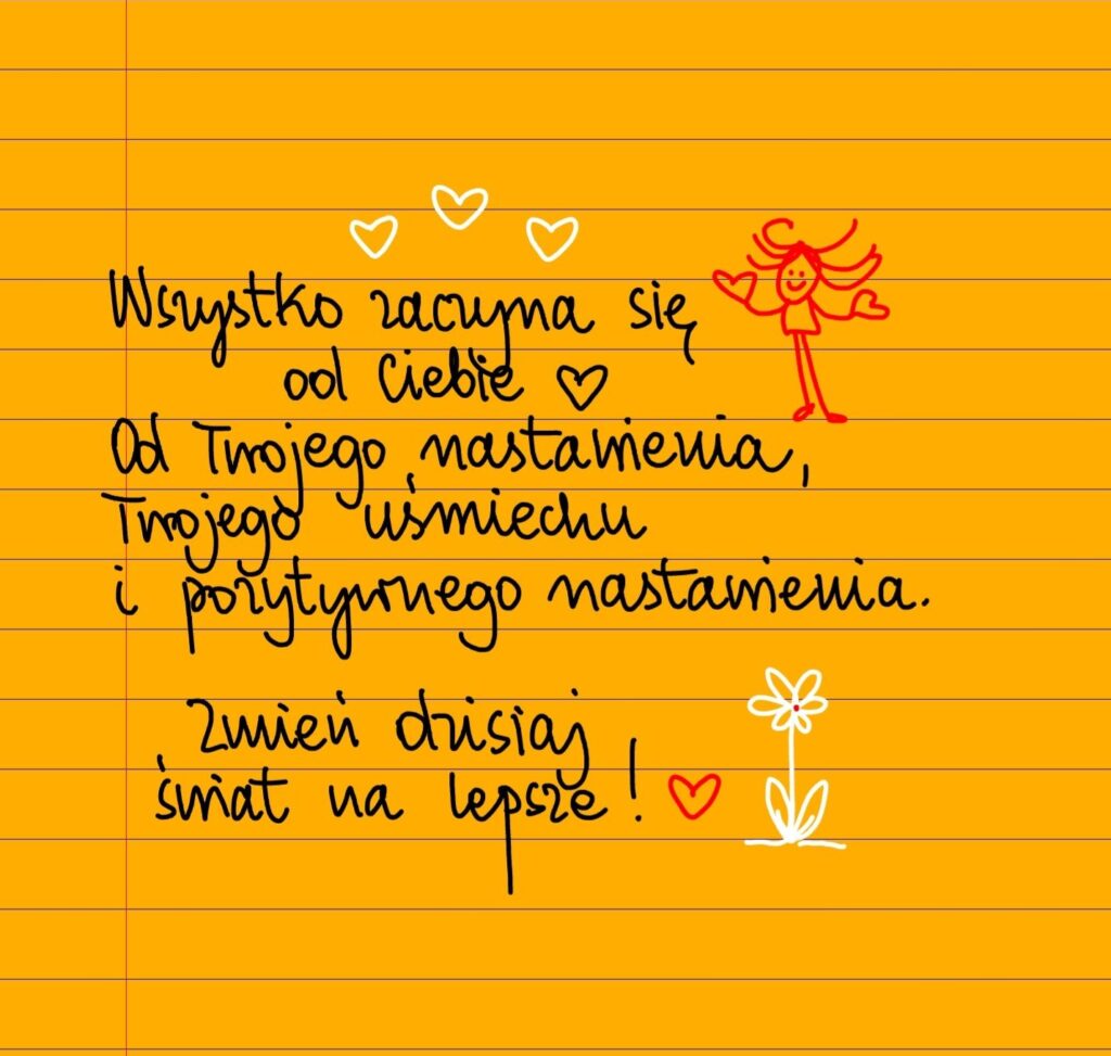 Wszystko zaczyna się od ciebie. Od twojego nastawienia, twojego uśmiechu i pozytywnego nastawienia. Zmień dzisiaj świat na lepsze 😊