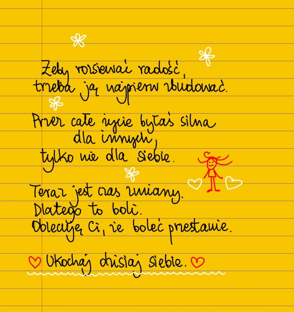 Żeby rozsiewać radość, trzeba ją najpierw zbudować. Przez całe życie byłaś silna dla innych, tylko nie dla siebie. Teraz jest czas zmiany. Dlatego to boli. Obiecuję Ci, że przestanie boleć. Ukochaj dzisiaj SIEBIE. ❤ #żółtakartka