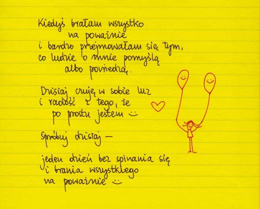 Kiedyś brałam wszystko na powaznie i bardzo przejmowałam się tym, co ludzie o mnie pomyślą albo powiedzą. Dzisiaj czuję w sobie luz i radość z tego, że po prostu jestem 🙂 Spróbuj dzisiaj – jeden dzień bez spinania się i…