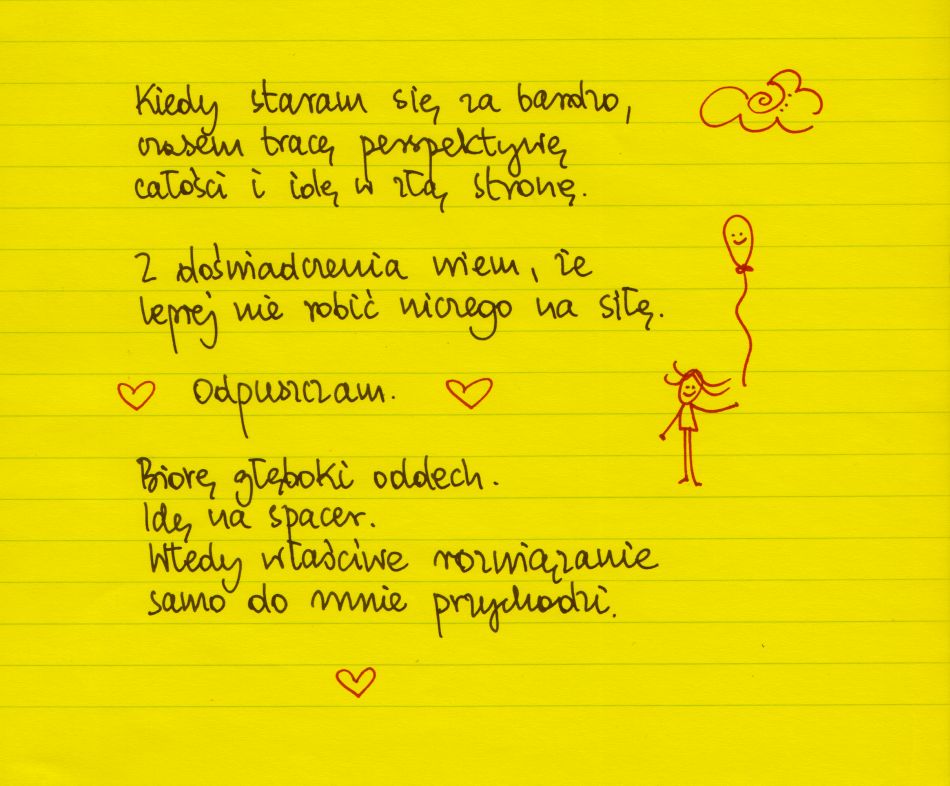 Kiedy staram się za bardzo, czasem tracę perspektywę calości i idę w złą stronę. Z doświadczenia wiem, że lepiej nie robić niczego na siłę. Odpuszczam. Biore głęboki oddech. Idę na spacer. Wtedy właściwe rozwiązanie samo do mnie przychodzi. #żółtakartka