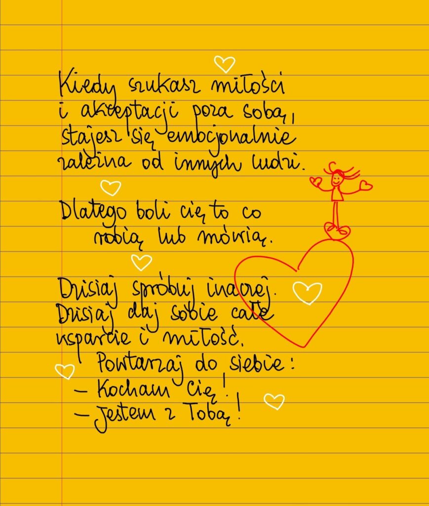 Kiedy szukasz miłości i akceptacji poza sobą, stajesz się emocjonalnie zależna/zależny od innych ludzi. Dlatego boli cię to co robią lub mówią. Dzisiaj spróbuj inaczej. Dzisiaj daj samej/samemu sobie całe wsparcie i miłość. Powtarzaj do siebie: – Kocham cię! Jestem z tobą! #żółtakartka