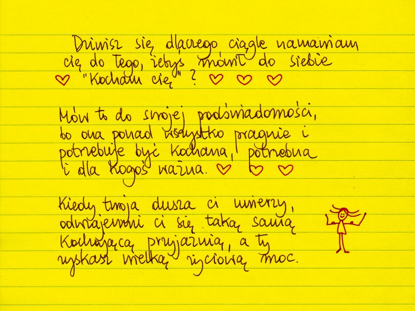 Dziwisz się dlaczego ciągle namawiam cię do tego, żebyś mówił do siebie „Kocham cię”? Mów to do swojej podświadomości, bo ona ponad wszystko pragnie i potrzebuje być kochana, potrzebna i dla kogoś ważna. Kiedy twoja dusza ci uwierzy, odwzajemni ci się taką samą kochającą przyjaźnią, a ty zyskasz wielką życiową moc ❤