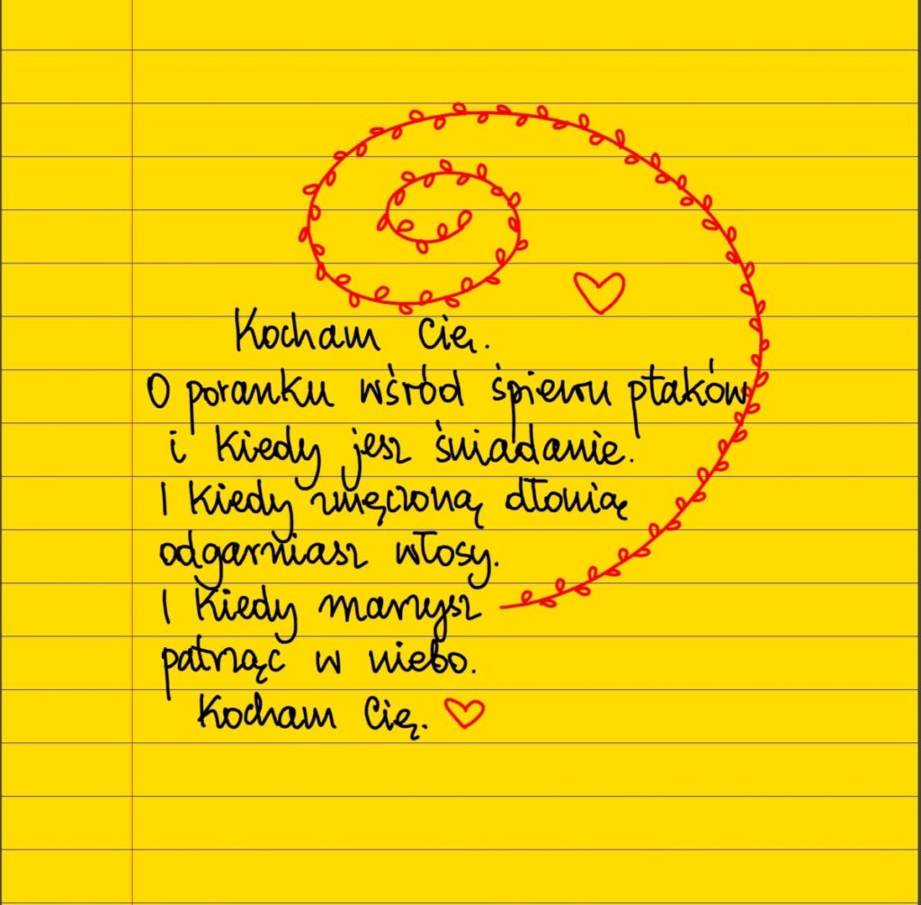 Kocham Cię. O poranku wśród śpiewu ptaków i kiedy jesz śniadanie. I kiedy zmęczoną dłonią odgarniasz włosy. I kiedy marzysz patrząc w niebo. Kocham cię. #żółtakartka