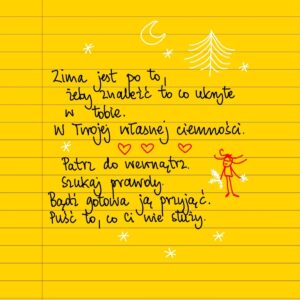 Szary grudniowy zmierzch. Idę przed siebie. Po białym niebie płyną ciemne chmury jak stado wielorybów. Płonące latarnie wyglądają jak tysiąc słońc. Wiatr dotyka mnie z jednej, potem z drugiej strony. Kołyszę się z nim jak kwiat. Jestem taka szczęśliwa. Tak bardzo, że czuję łzy wdzięczności w oczach. Ten cudny zimowy wieczór. Śnieg stopniał, droga pełna błota, czarne gałęzie drzew. Prawda jest piękna niezależnie od tego jak wygląda. Czy wiosenną burzą stokrotek, czy letnim strumykiem, czy jabłoniami pełnymi owoców na jesieni. Jestem wdzięczna za zimę, za ten dzień, ten wieczór, za moje życie, za powietrze, za każdy pomysł i działanie, jakie podejmę. Kocham ten czas, zabieram go w sercu do każdej sekundy, która zdarzy się w przyszłości.