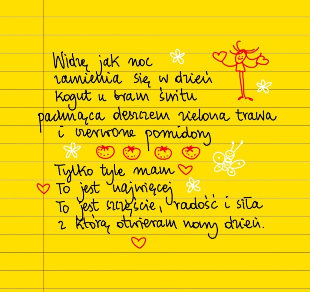 Widzę jak noc zamienia się w dzień, kogut u bram świtu, pachnącą deszczem zielona trawa i czerwone pomidory. Tylko tyle mam. To jest najwięcej. To jest szczęście, radość i siła, z którą otwieram nowy dzień #żółtakartka