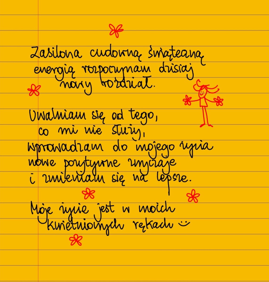 Zasilona cudowną świąteczną energią rozpoczynam dzisiaj nowy rozdział. Uwalniam się od tego, co mi nie służy, wprowadzam do mojego życia nowe pozytywne zwyczaje i zmieniam się na lepsze. Moje życie jest moich kwietniowych rękach 😊