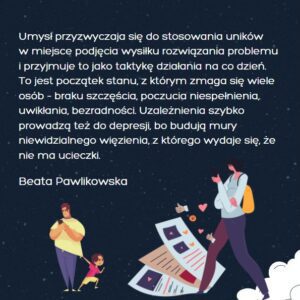 Dzień dobry, panie Mariuszu. Dziękuję za list. Ludzki umysł najmocniej przywiązuje się do tego, co najczęściej powtarza. Jest to mechanizm, którego celem u zarania było oszczędzanie cennej energii i tym samym zwiększenie szansy przetrwania. Natura nie przewidziała tego, że współczesny człowiek będzie żył wśród mnogości katastroficznych wiadomości, nadmiernego stresu, skażonego przemysłowymi toksynami powietrza, wody, żywności i ziemi, karmiąc się śmieciowym jedzeniem, zarywając noce i martwiąc się na zapas. Najczęściej powtarzane komunikaty stają się instynktowymi myślami. Do tego najnowsze badania naukowe wskazują na to, że depresja jest powiązana ze złym stanem jelit i dysbiozą, czyli przerostem szkodliwych bakterii nad pożytecznymi, co powoduje rozszczelnienie jelit i stany zapalne, także w mózgu. Nie jestem lekarzem ani naukowcem, jestem, tylko człowiekiem pasji, który przez kilkadziesiąt lat szukał odpowiedzi na pytanie jak żyć szczęśliwie. W wyjściu z depresji pomogło mi kilka prostych rzeczy, które opisałam w książce, a najważniejszą z nich było uświadomienie sobie, że ja CHCĘ odzyskać panowanie nad moim umysłem, chcę żyć inaczej, chcę włożyć choćby najmniejszy wysiłek w odzyskanie mojego życia. Czy byłby pan gotów zainwestować 10 minut dziennie w to, żeby zmienić swoje życie? Dziesięć minut dziennie absolutnie CODZIENNIE, niezależnie od tego czy ma pan na to ochotę czy nie? Jeśli tak, to chciałabym wysłać panu w prezencie książkę pt. „Księga dobrych myśli”. Pana zadaniem będzie przeczytać jedną stronę tej książki codziennie rano. Po co? Żeby zacząć zapisywać nowy rodzaj życiowego komunikatu, który ma przejąć władanie nad pana umysłem i codziennie małymi dawkami karmić go nadzieją, miłością i siłą. Tyle na początek, żeby dać panu choć małą iskierkę, z której powstanie większy ogień i rozświetli mrok. Serdecznie pozdrawiam i jestem z panem myślami.