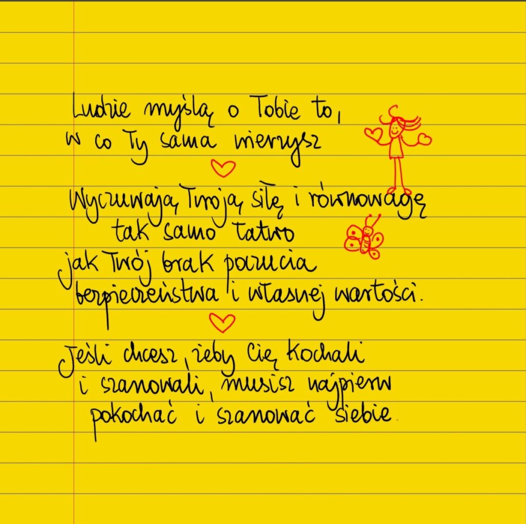Ludzie myślą o Tobie to, w co Ty sama wierzysz. Wyczuwają Twoją siłę i równowagę tak samo łatwo jak Twój brak poczucia bezpieczeństwa i własnej wartości. Jeśli chcesz, żeby Cię kochali i szanowali, musisz najpierw pokochać i szanować siebie. #żółtakartka