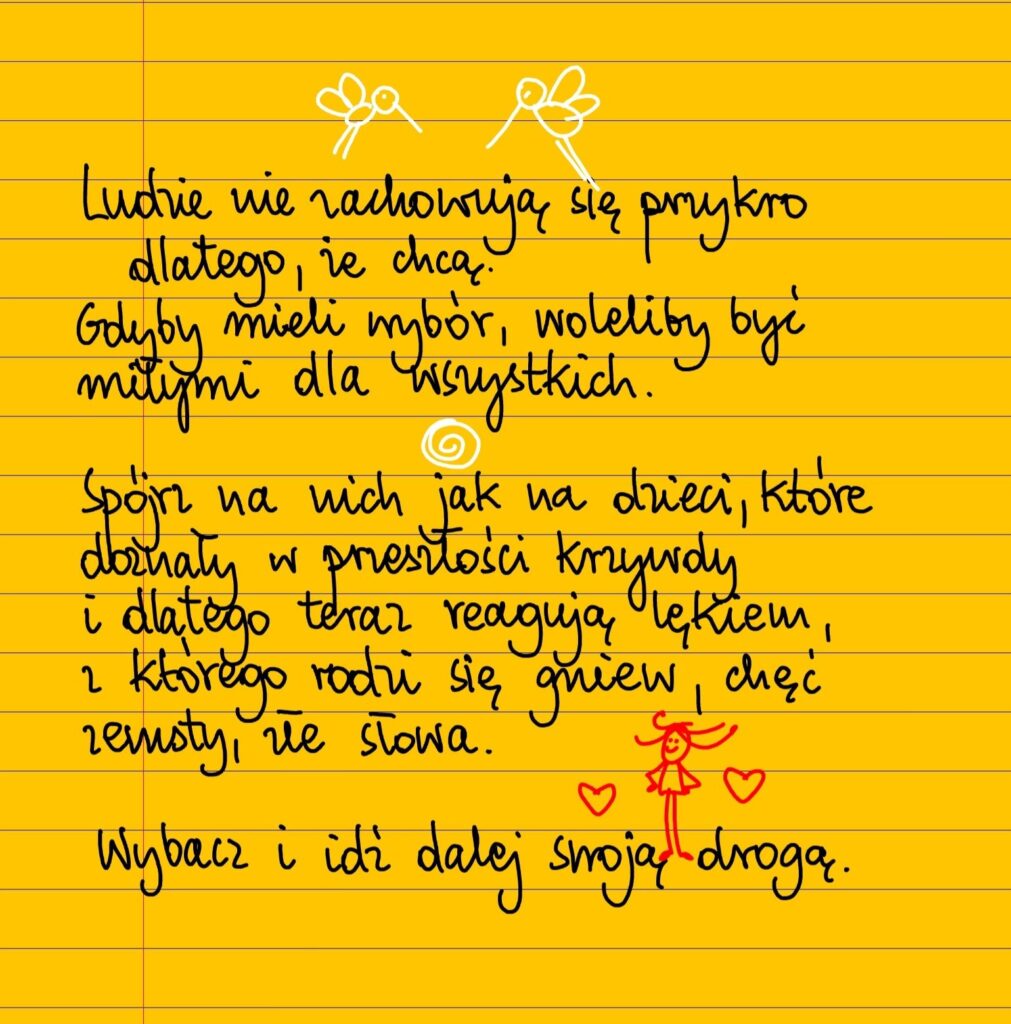 Ludzie nie zachowują się przykro dlatego, że chcą. Gdyby mieli wybór, woleliby być miłymi dla wszystkich i zawsze. Spójrz na nich jak na dzieci, które doznały w przeszłości krzywdy i dlatego teraz reagują lękiem, z którego rodzi się zazdrość, nienawiść, chęć zemsty, złe słowa. Wybacz i idź dalej swoją drogą.  ❤ #żółtakartka #BeataPawlikowska