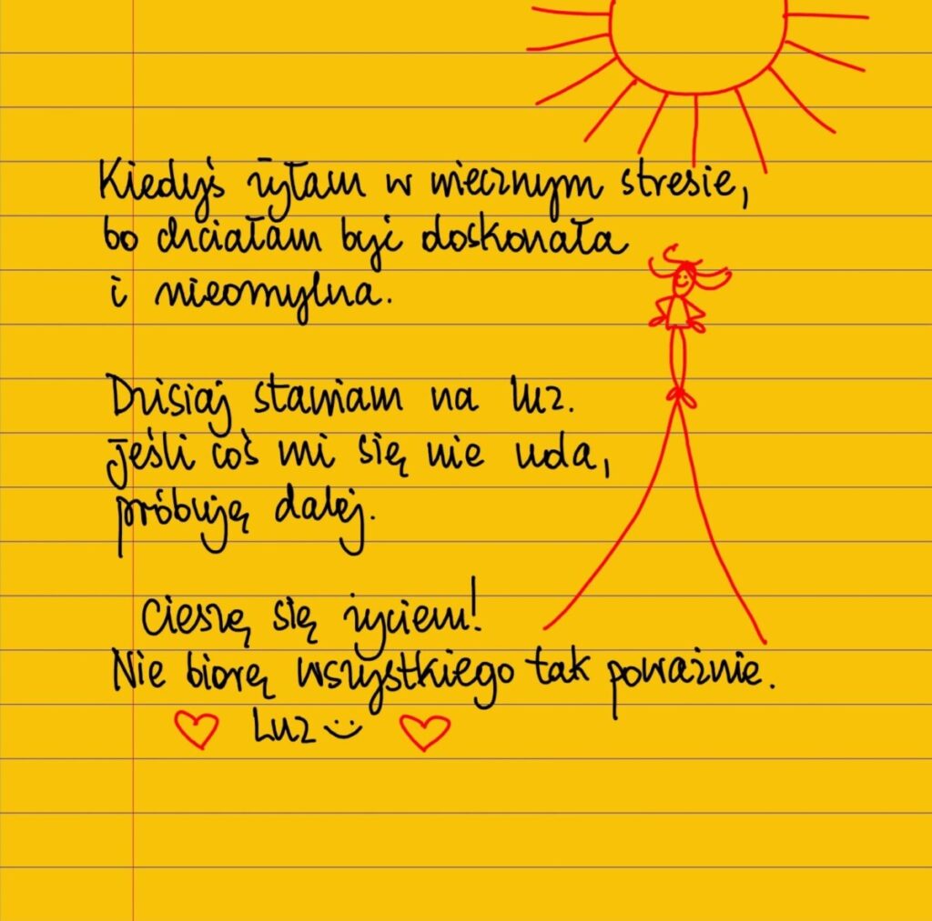 Kiedyś żyłam w wiecznym stresie, bo chciałam być doskonała i nieomylna. Dzisiaj stawiam na luz. Jeśli coś mi się nie uda, próbuję dalej. Cieszę się życiem. Nie biorę wszystkiego zbyt poważnie. Dzisiaj wyluzuję. #żółtakartka