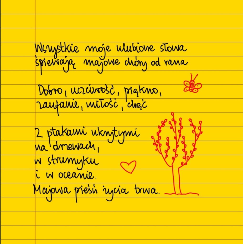 Wszystkie moje ulubione słowa śpiewają majowe chóry od rana. Dobro, uczciwość, piękno, zaufanie, miłość chęć. Z ptakami ukrytymi w drzewach, w strumyku i oceanie. Majowa pieść życia trwa. #żółtakartka