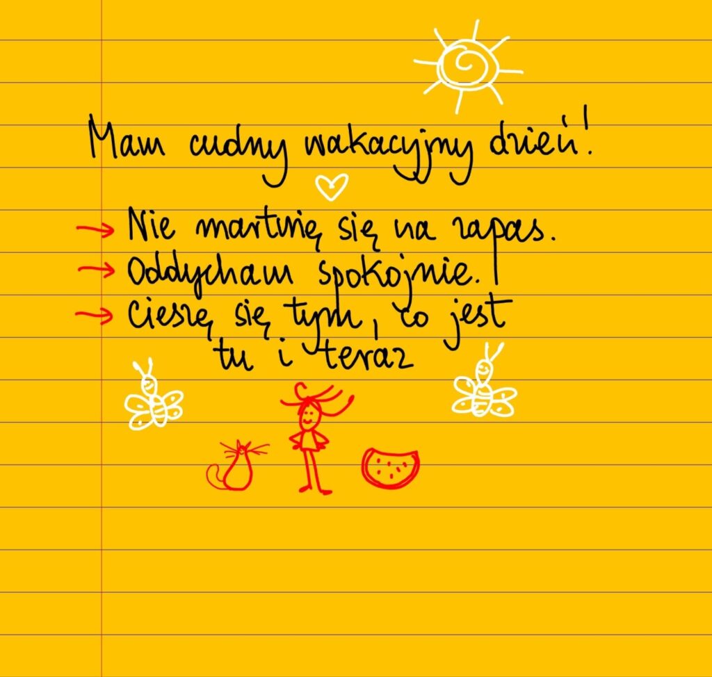 Mam piękny wakacyjny dzień! Nie martwię się na zapas. Oddycham spokojnie, cieszę się tym, co jest tu i teraz. Myśli mogą przyjść i odejść —nie muszę za nimi podążać. Słońce świeci, chwila trwa. To wystarczy. 🌞🌿