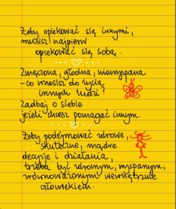 – Dziękuję – odrzekłam – ale nie piję alkoholu, bo wiem w jaki sposób alkohol szkodzi zdrowiu i nie chcę nikogo do tego namawiać.